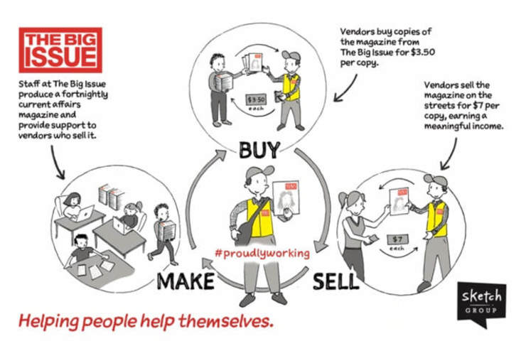 The big issue operates in the UK as well and I love its approach to helping rough sleepers get back on their feet. This is a great example of how sketchnotes can help quickly explain a complex system.