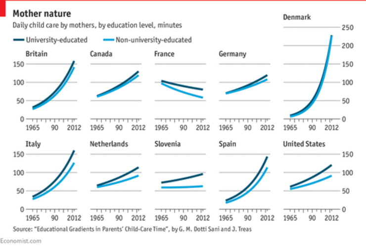 PARENTS these days spend a lot more time with their offspring, or at least middle-class parents do. One analysis of 11 rich countries estimates that the average mother spent 54 minutes a day caring for children in 1965 but 104 minutes in 2012.