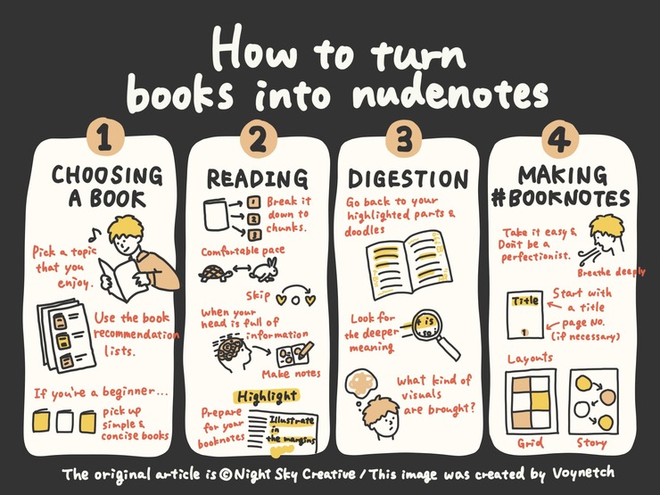 Visual summary of an article “How to turn books into nudenotes” by Night Sky Creative. https://www...